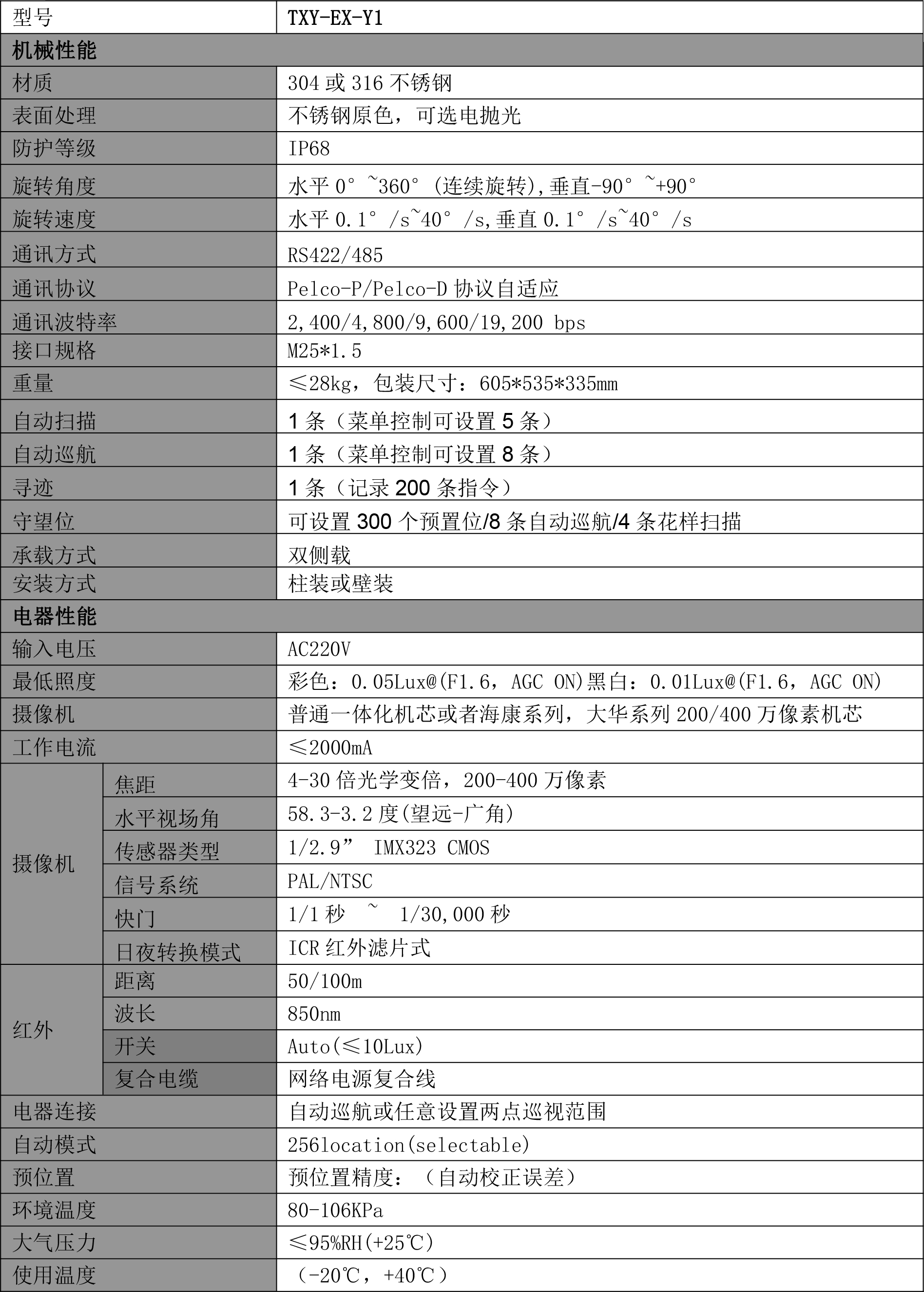TXY-EX-Y1攝像機是一種結合了防爆技術與云臺控制功能的先進監控設備。它將高清攝像技術與防爆設計完美結合,適用于各種潛在爆炸性環境的監控應用。該產品具備高度的穩定性和清晰度,能夠提供全方位、無死角的視頻監控解決方案。 通常采用一體化設計,集成了攝像頭、云臺、防護罩等組件,使得安裝和維護更加簡便。同時,它還具備防爆外殼和內部電路設計,能夠在易燃易爆的環境中穩定運行,確保監控系統的可靠性和安全性。